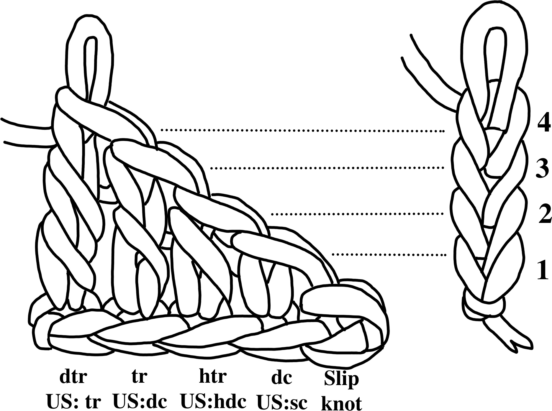 tr, treble (US: dc, double crochet)
