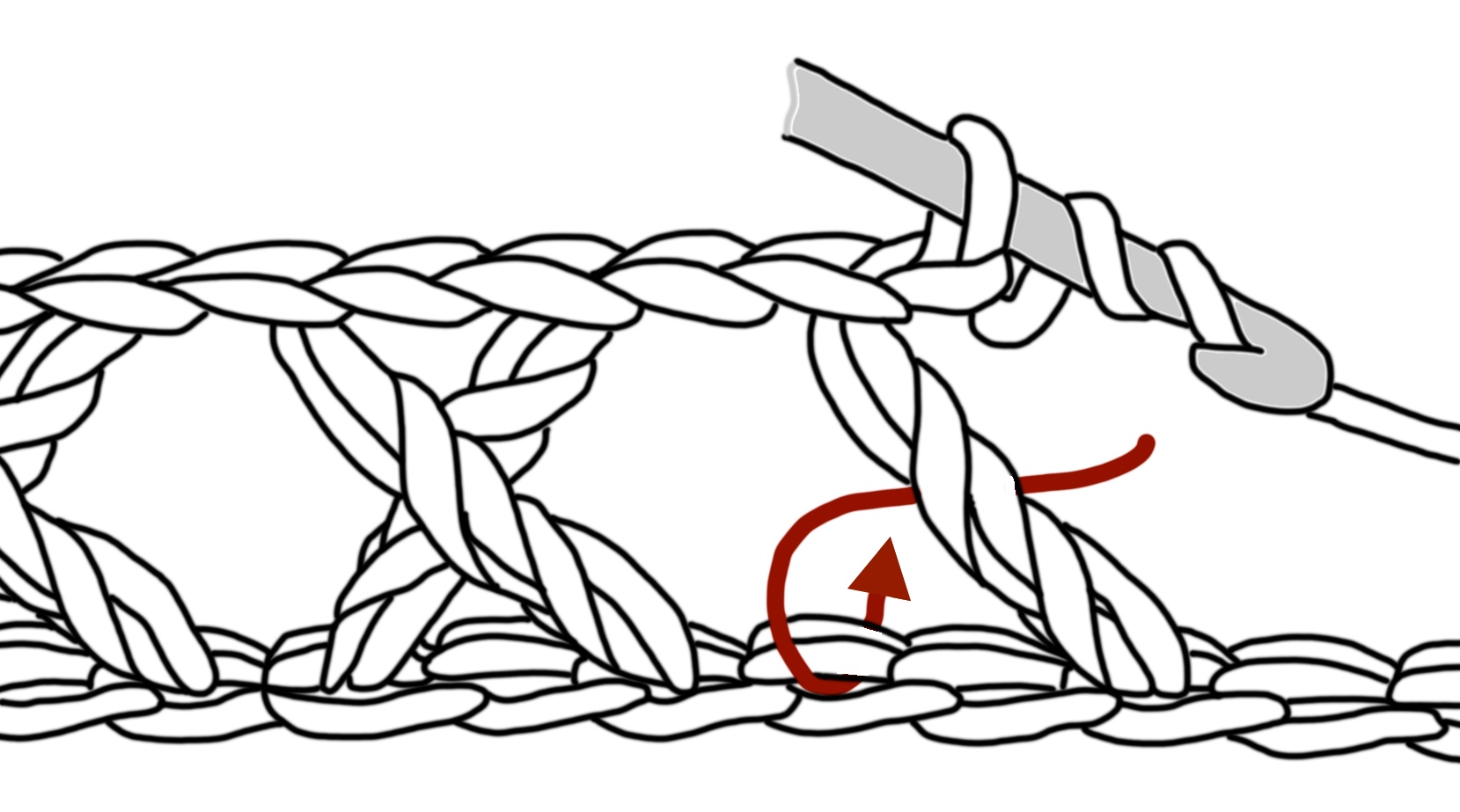 Subsequent rows: 4 ch ((beginning-chain) this is the first stitch of the row & therefore must be counted & used as a stitch), turn, work from 1 to 3, under both loops of each stitch across the row