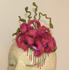 Assembly:I covered the Fascinator base with a hand-felted patch & the flower, greenery & beads were then attached to the felt-covered base – by all means copy what I’ve done but don’t be afraid to experiment – this pattern is meant as a guide only – enjoy…